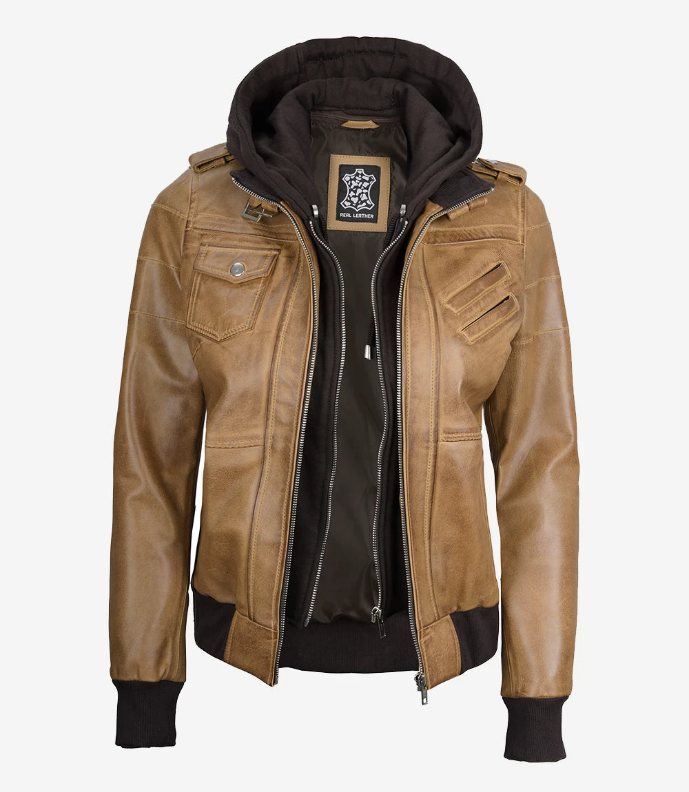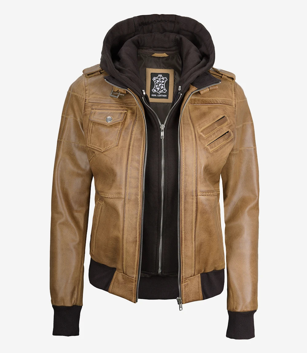 Womens Camel Brown Hooded Bomber Leather Jacket