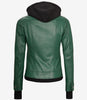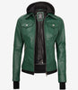 Womens Green Bomber Leather Jacket with Removable Hood